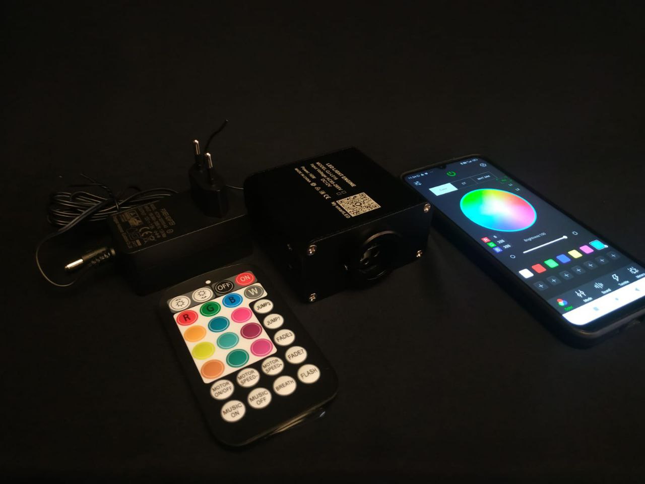 Проектор комплектуется пультом дистанционного управления что позволяет легко и быстро регулировать яркостью , цветом и скоростью мерцания. А так же есть возможность подключиться к смартфону скачав приложение My Smart Led на Ваш смартфон.